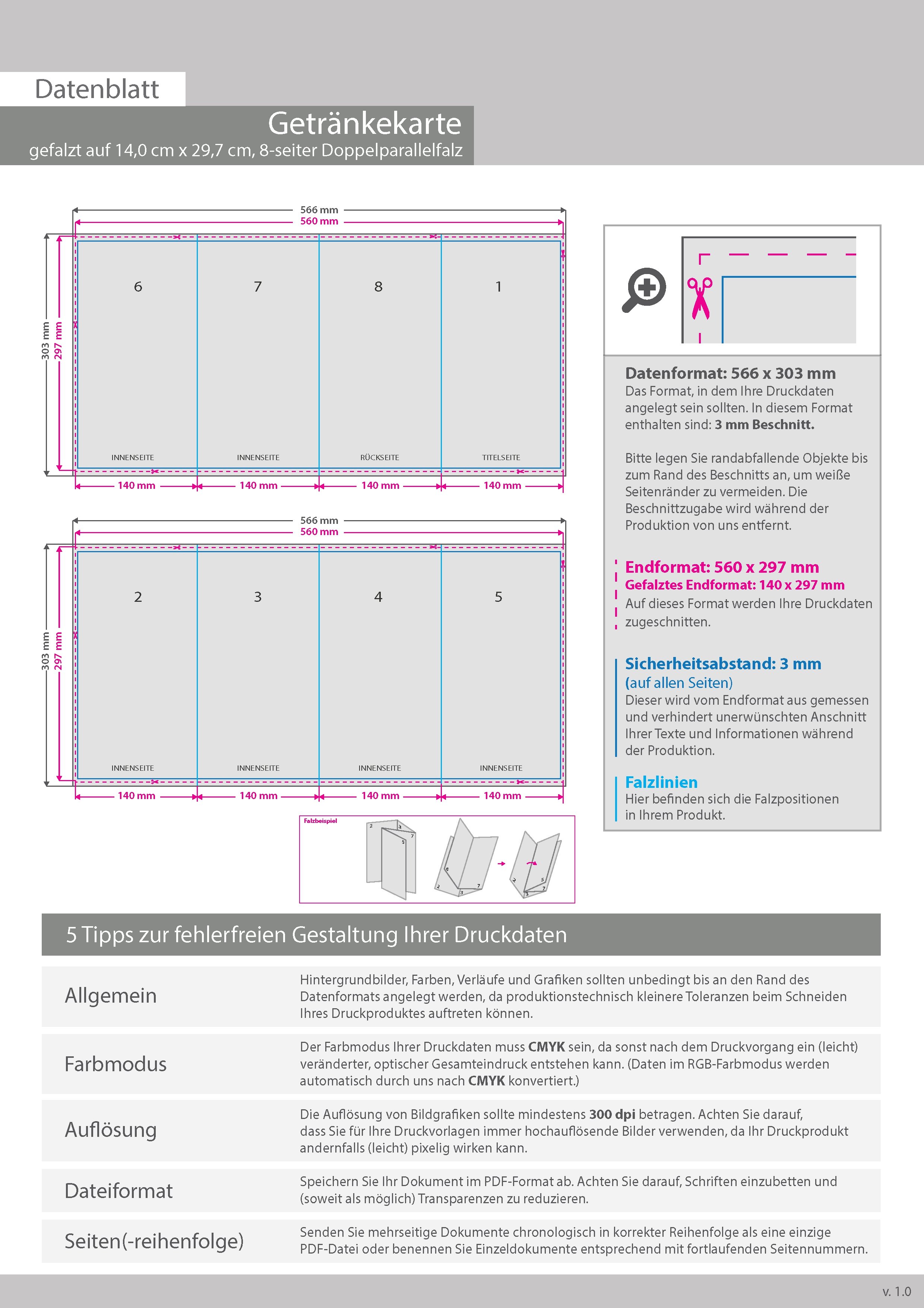 Getränkekarte, gefalzt auf 14,0 cm x 29,7 cm, 8-seiter (Doppelparallelfalz)