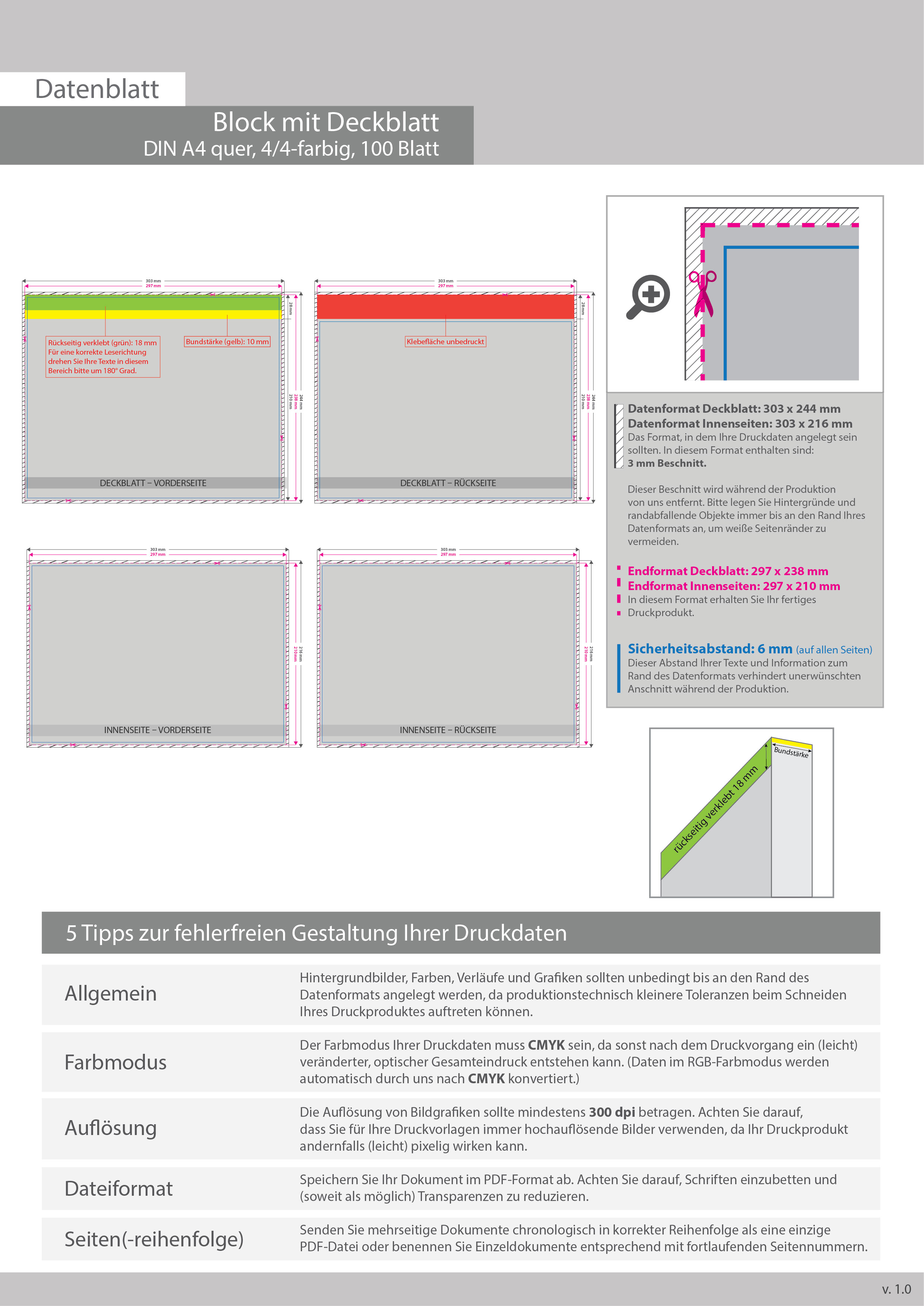 Block mit Leimbindung und Deckblatt, DIN A4 quer, 100 Blatt, 4/4 farbig beidseitig bedruckt